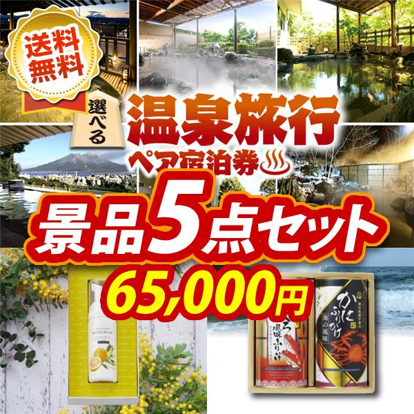 二次会景品5点セット【選べる!全国温泉旅行ペア宿泊券、味工房 海鮮ふりかけ 他】送料無料!特大パネル・目録・特典付き!ビンゴや忘年会景品にも!